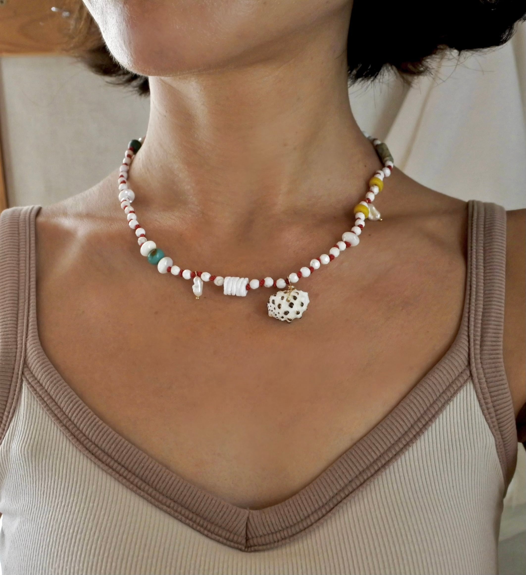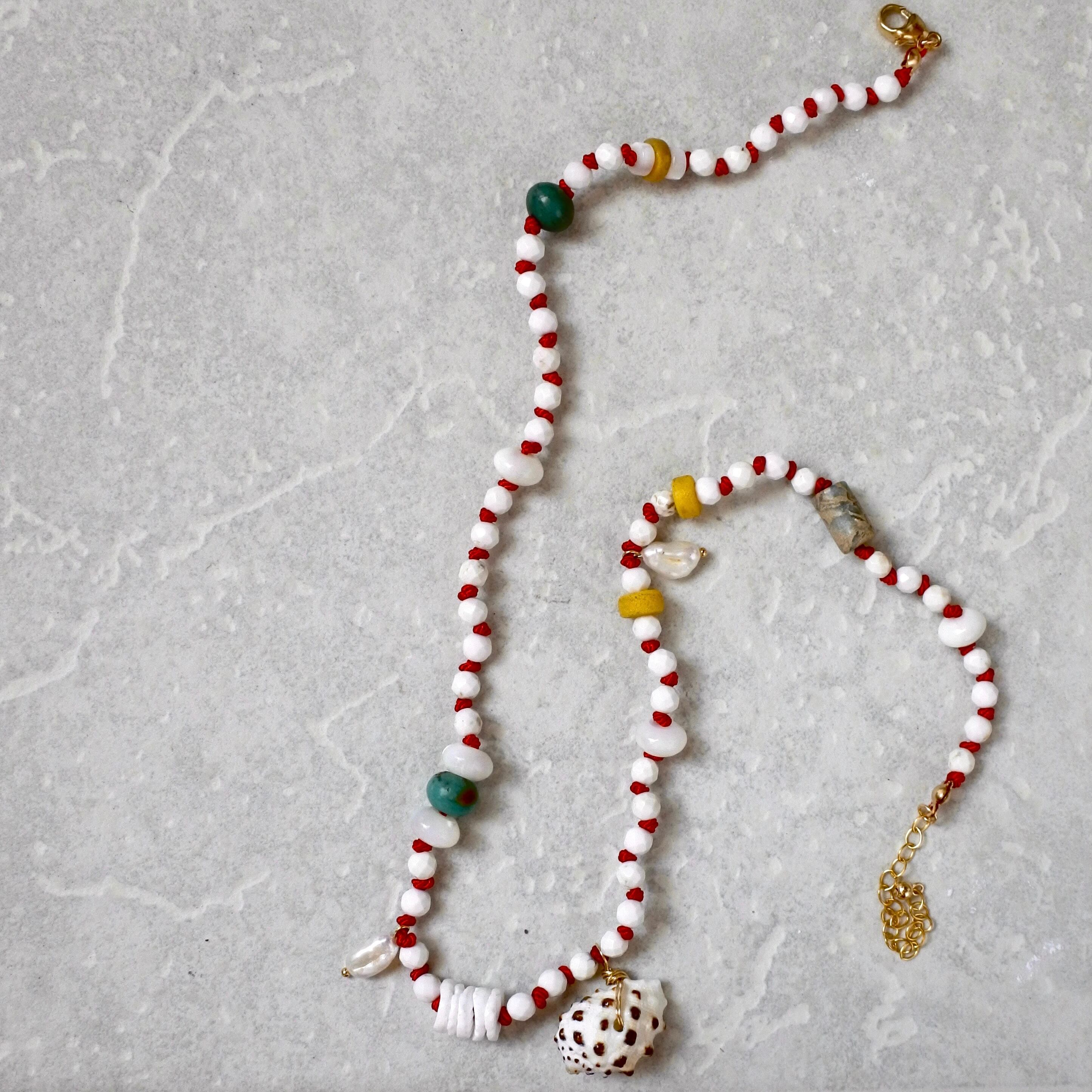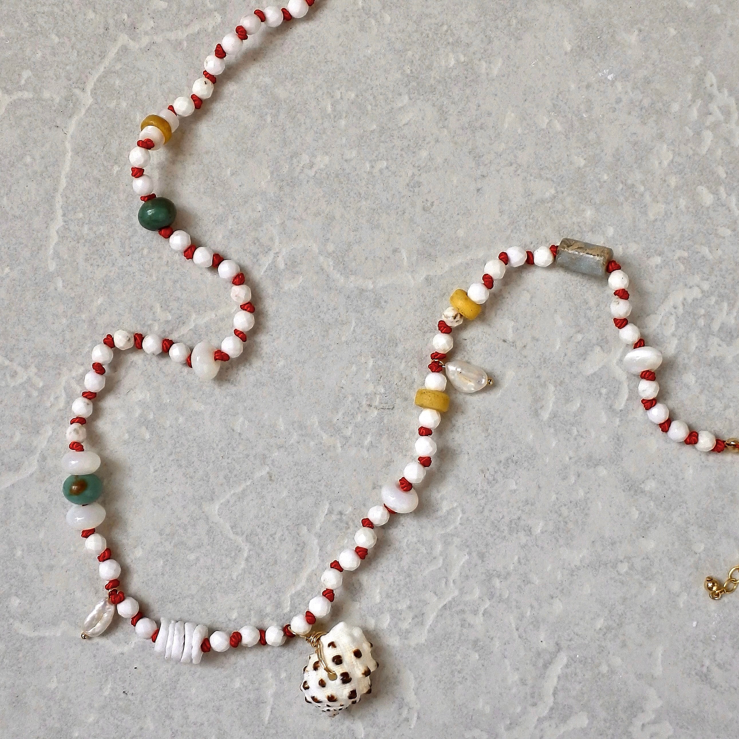 マグネサイトを主に、シルクの糸、パール、シェル、天然石など… (金具類は全て※14kgf)